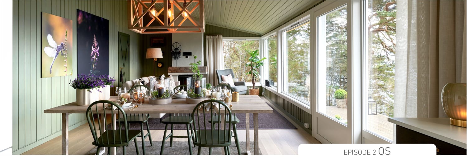I Os besøker Eventyrlig oppussing en koselig hytte beliggende i skogkanten, med utsikt ut over vannet.
